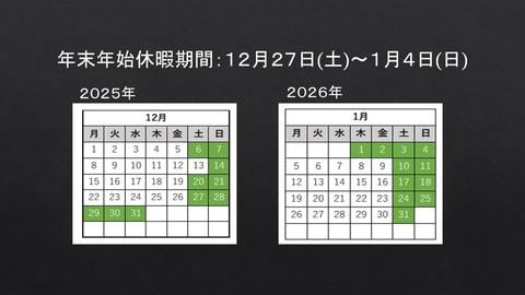 新着情報とお知らせ 一覧へ戻る年末年始休暇のお知らせ2025-12-11年末年始休暇期間について誠に勝手ながら、弊社では下記の期間を年末年始休暇とさせていただきます。年末年始休暇期間:2025年12月27日(土)~2026年1月4日(日)休暇中につきましては、ご不便・ご迷惑をお掛けいたしますが何卒ご理解賜りますようお願い申し上げます。